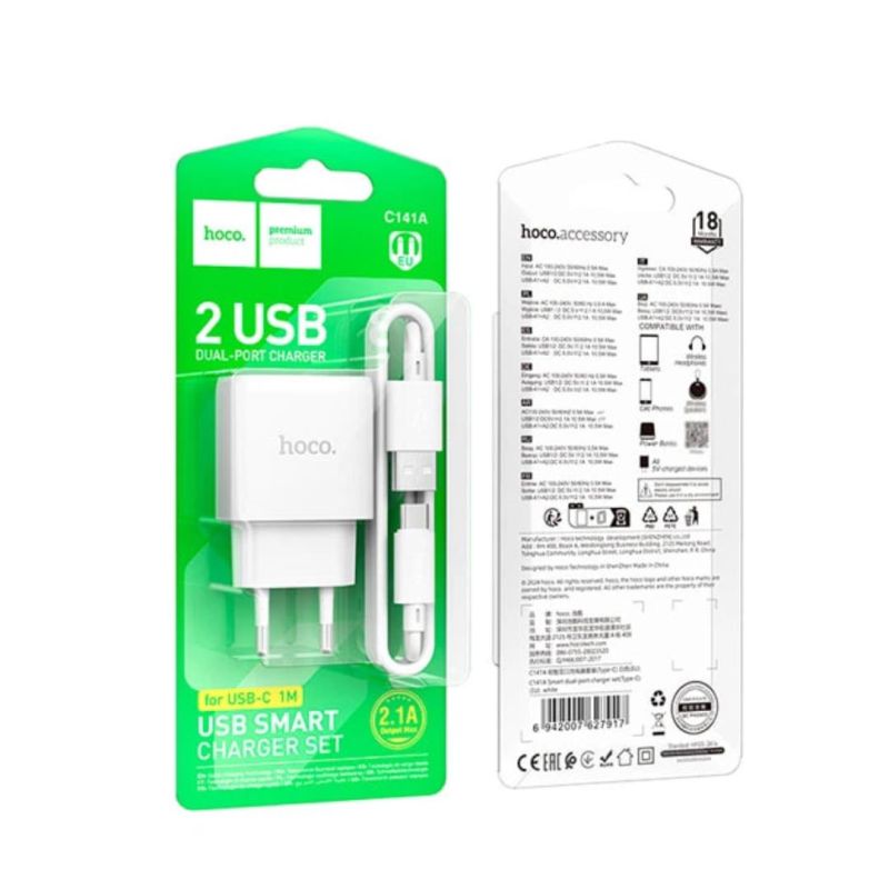 МЗП-USB HOCO C141A 2USB/2.4A + кабель Type-C White