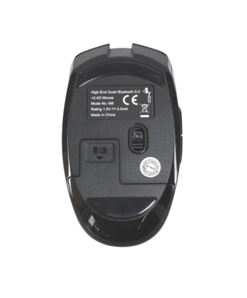 Когда батарея установлена в мышь без подключенного приемника, она переходит непосредственно в режим Bluetooth, индикатор мигает рядом с роликом, мышь ищет устройство и ожидает, пока устройство будет найдено. Откройте устройства Bluetooth, выберите из списка "4YOU M8" и подключите. В режиме Bluetooth индикатор у ролика светится синим цветом.