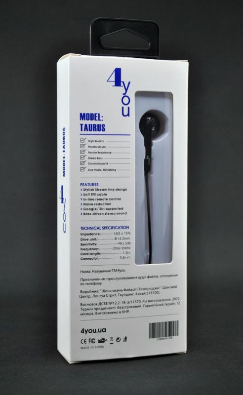 Гарнитура 4you TAURUS (EarPods design) black (от10шт - 10%) + Спец Цена