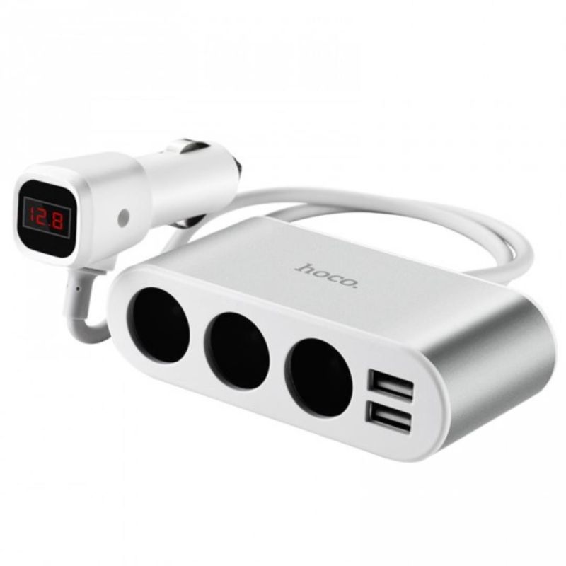 Трійник в прикурювач HOCO Z13 (3 порту + 2USB / 2.1A) Silver