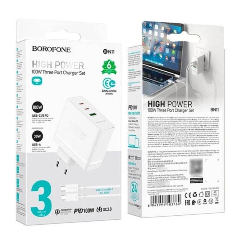 СЗУ-USB BOROFONE BN11 PD+QC3.0 100W/3A (1 Usb/2Type-C)+ кабель Type-C-Type-C White